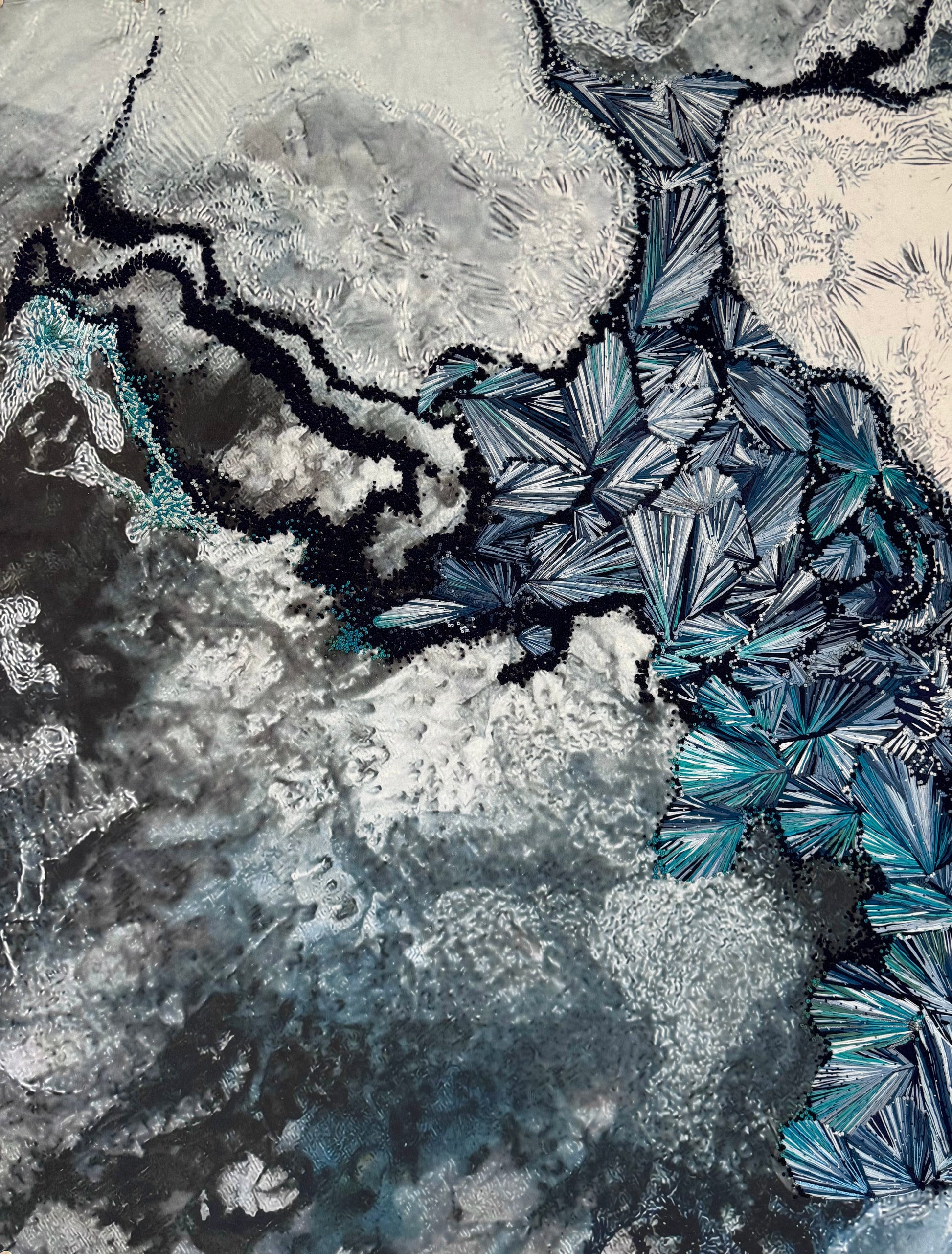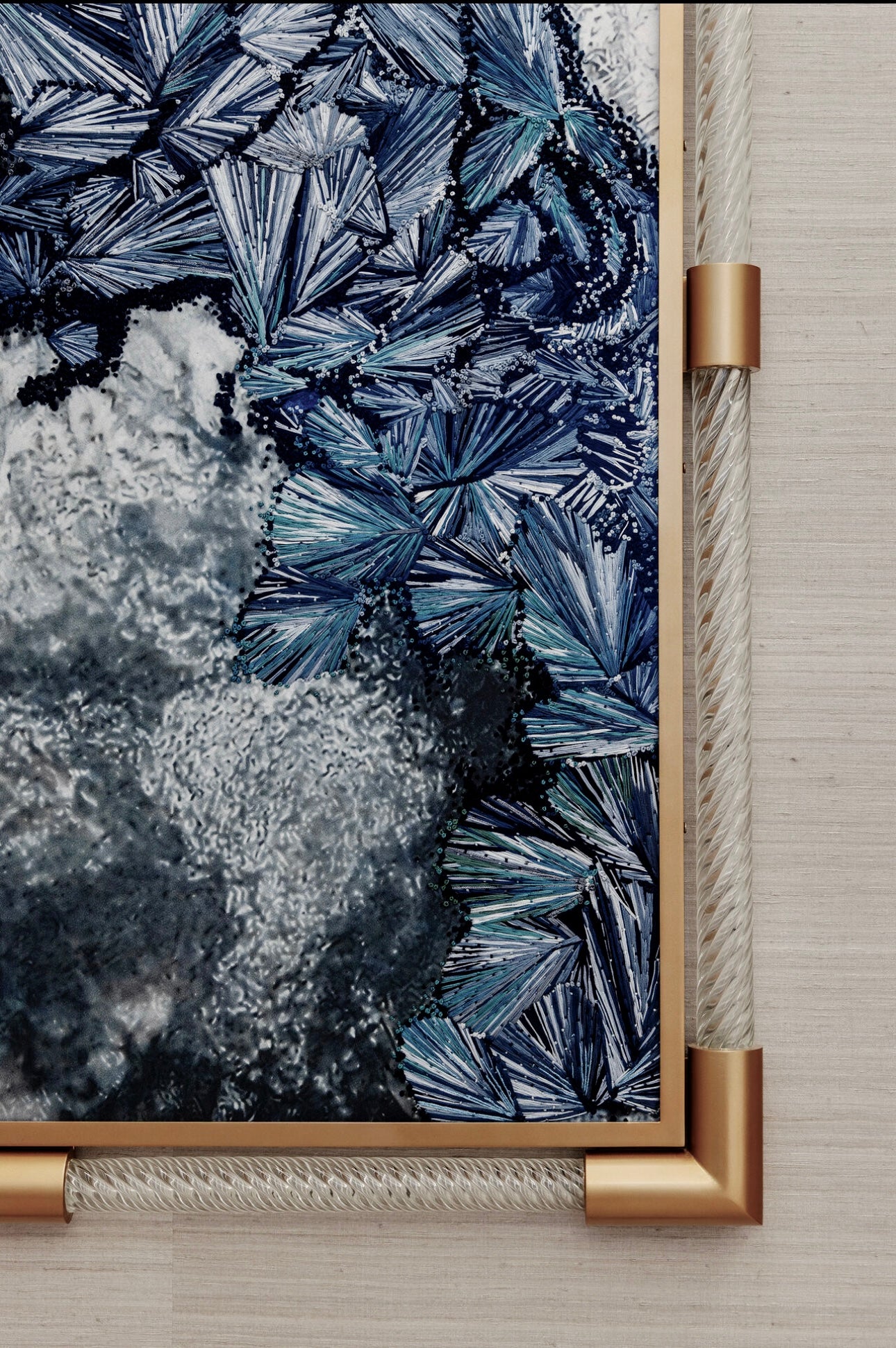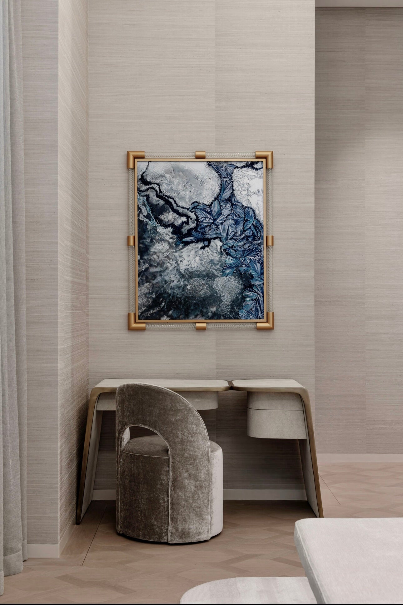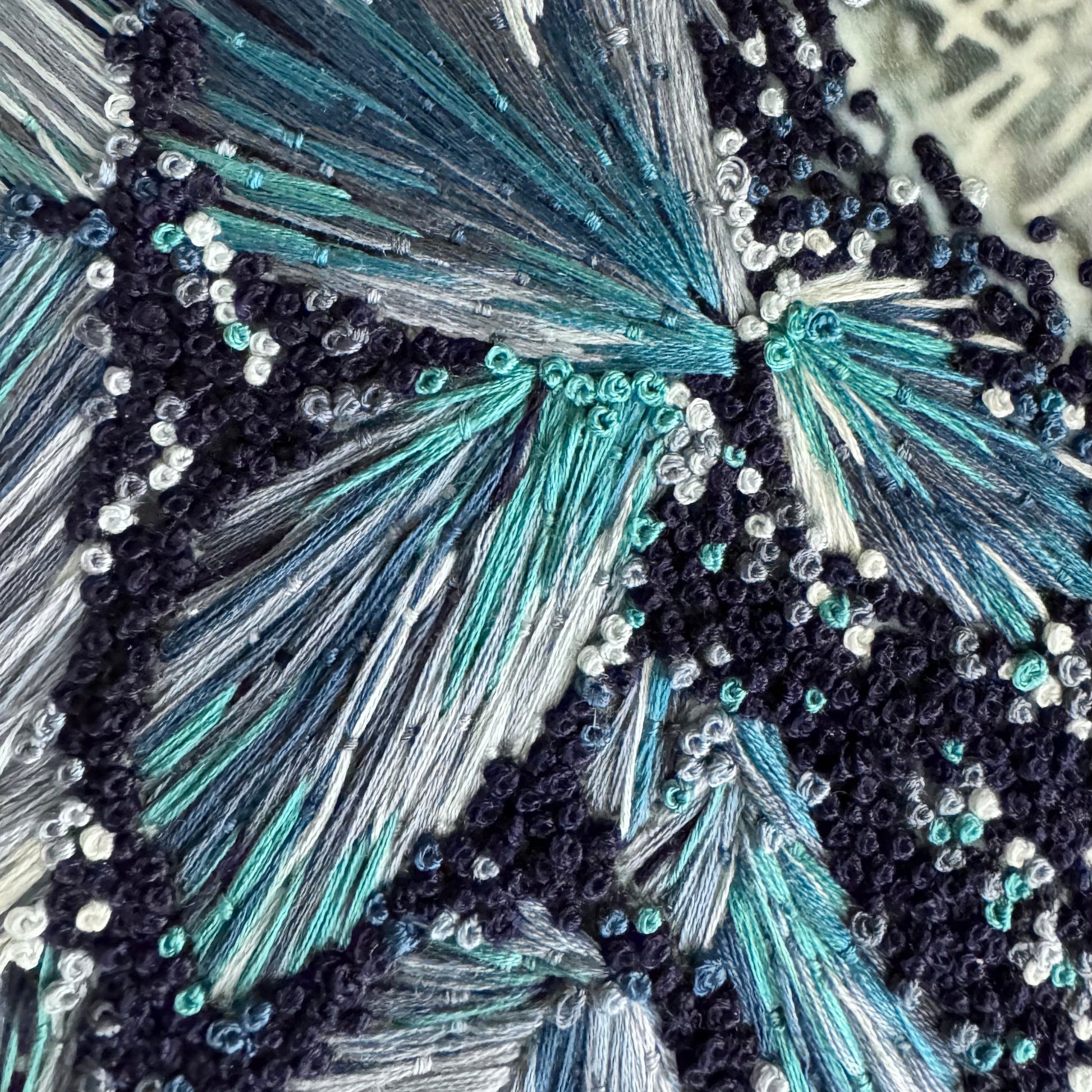 A delicate combination of a digital artwork and textured hand embroidered areas, custom made for the Waldorf Astoria in Ras al Khaima.