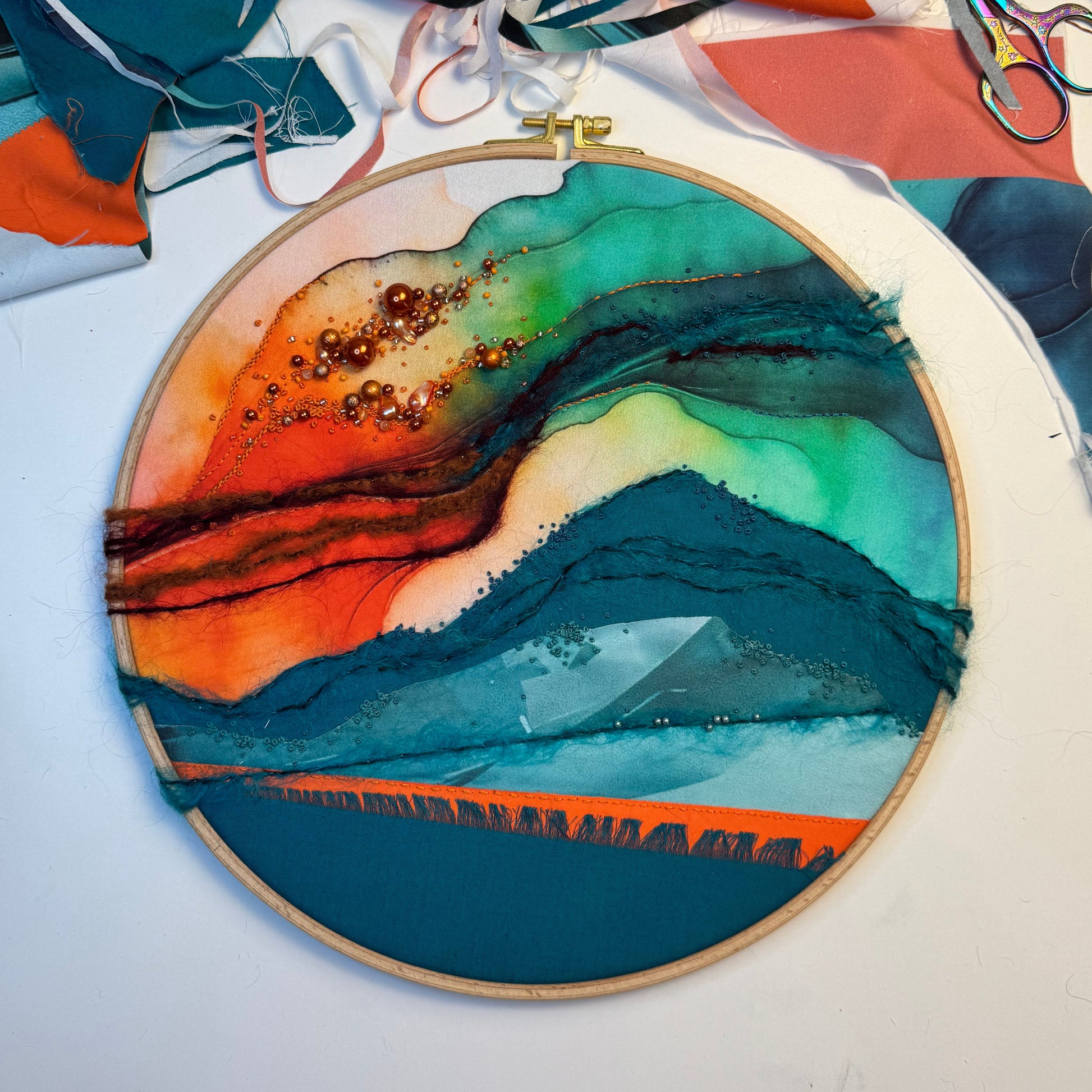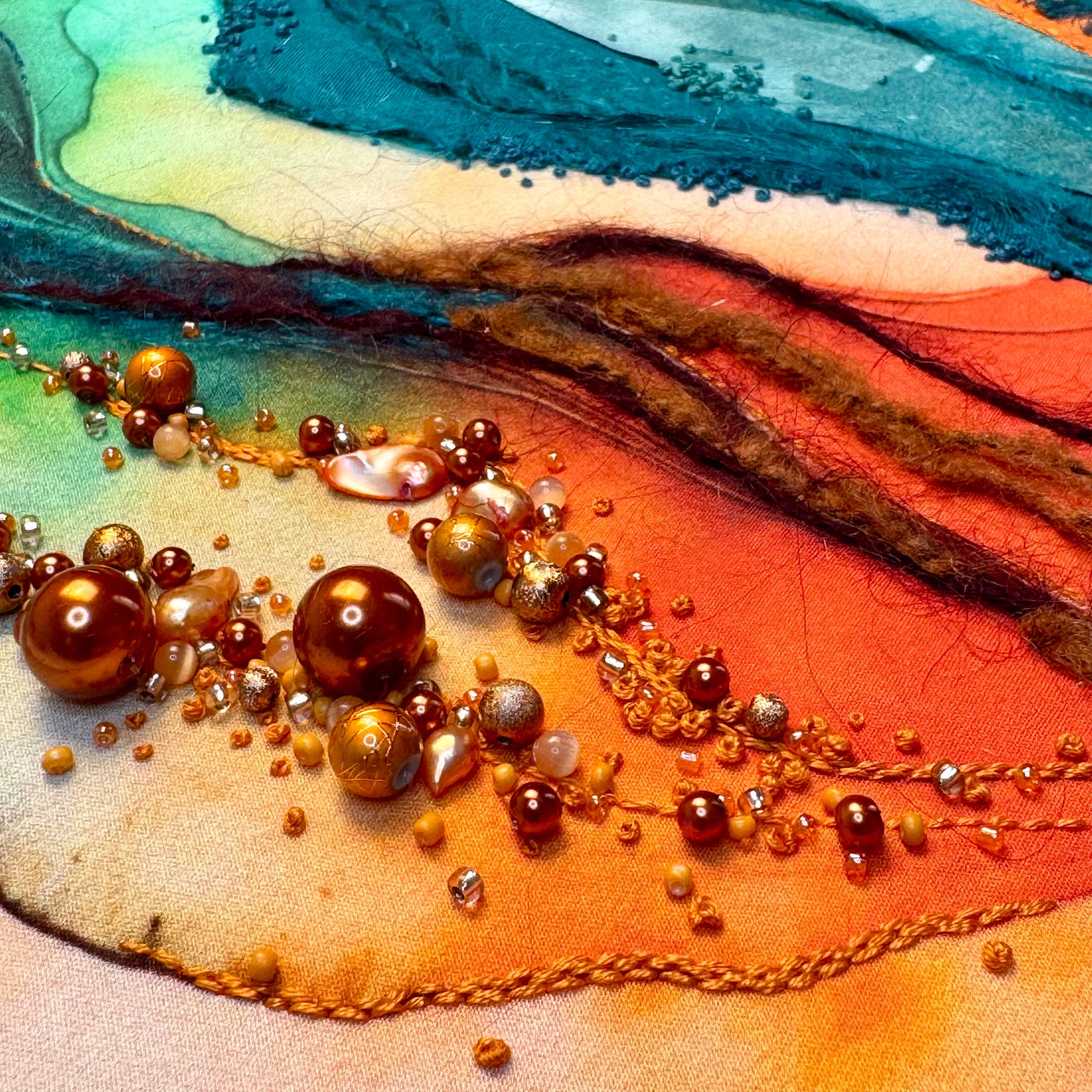 This piece is a study in movement and texture, where layered fabric, wool, and pearls flow together in a suspended landscape. The circular frame holds a moment of drift—shifting light, soft currents, and rising forms. Pearls shimmer like quiet echoes across the surface, inviting reflection on rhythm, stillness, and the tactile language of materials.