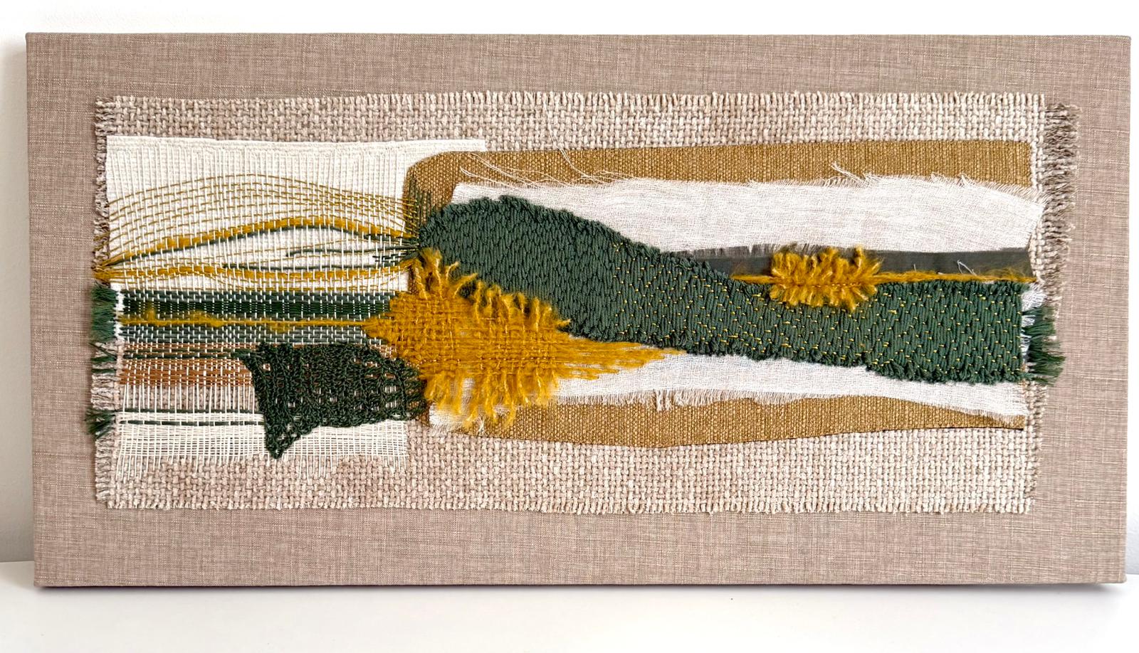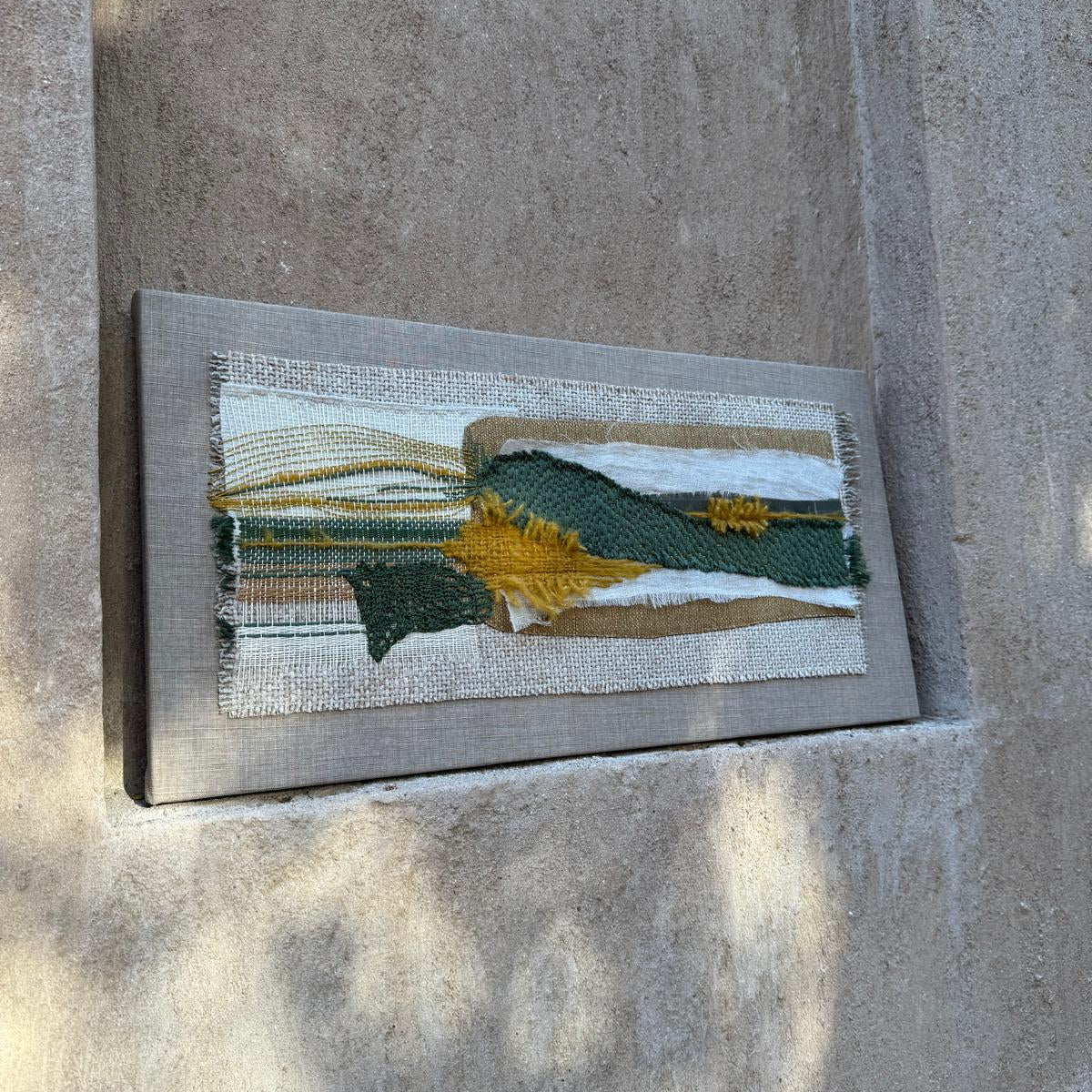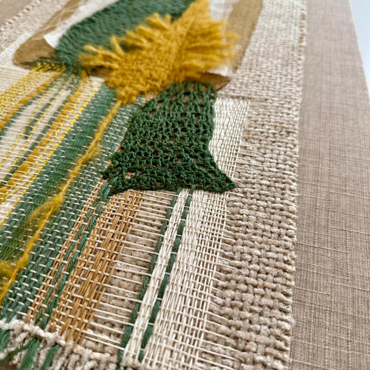 This work presents Nur as a gentle, guiding force unfolding across time. Horizontal layers of natural textiles create a flowing rhythm, symbolizing continuity, patience, and spiritual grounding. Muted greens, soft whites, and restrained golden accents suggest calm movement and inner balance.
