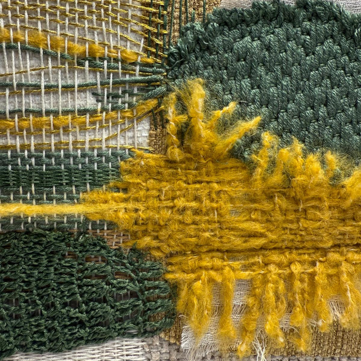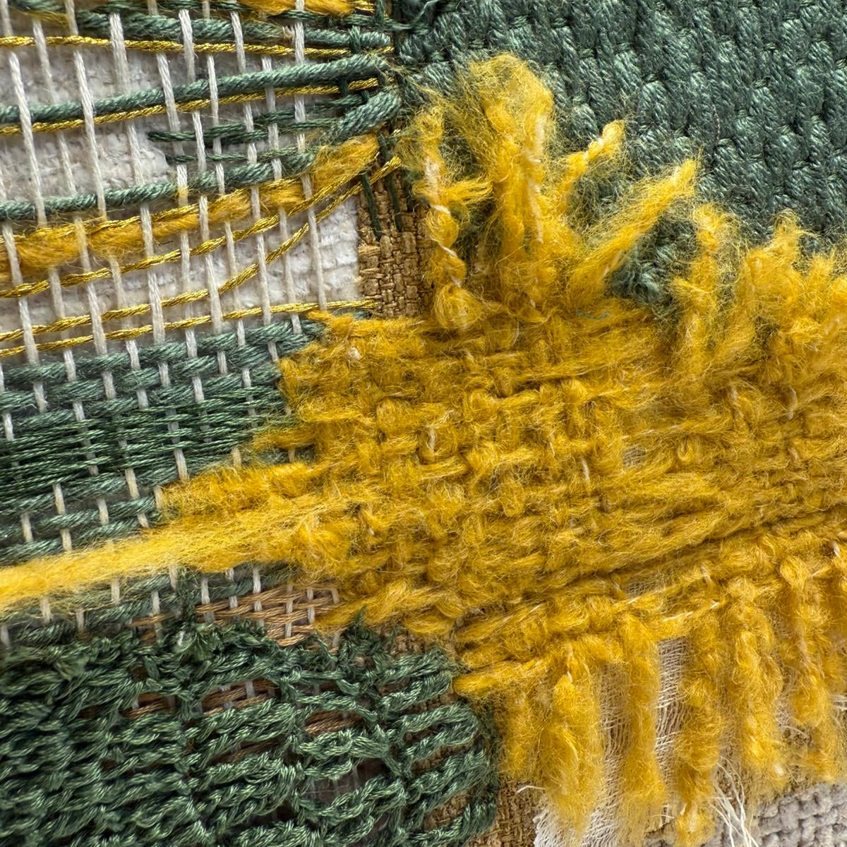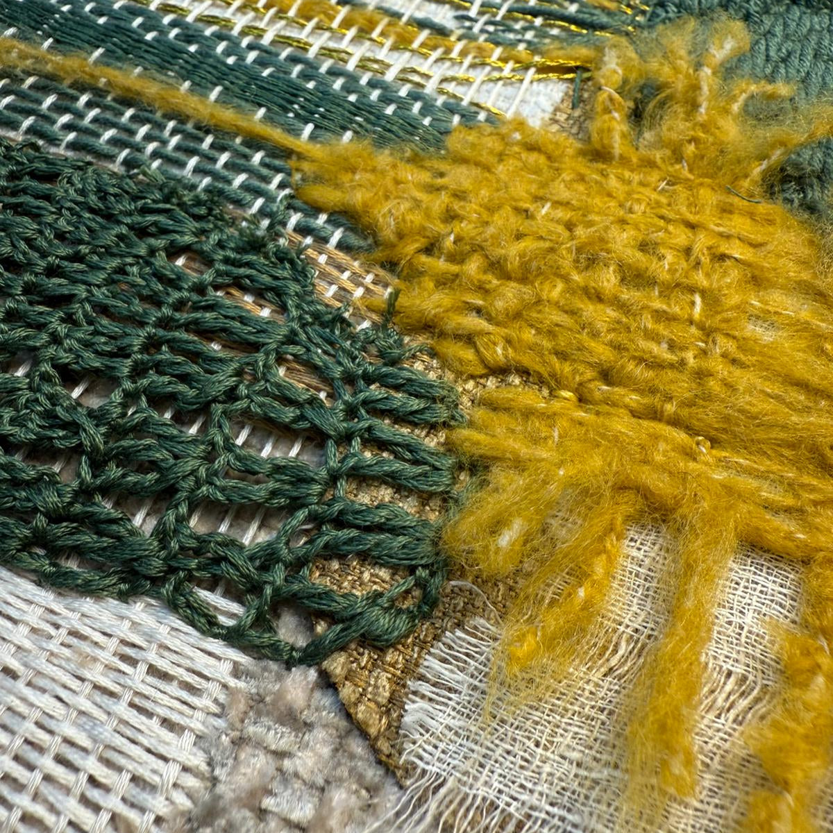 This work presents Nur as a gentle, guiding force unfolding across time. Horizontal layers of natural textiles create a flowing rhythm, symbolizing continuity, patience, and spiritual grounding. Muted greens, soft whites, and restrained golden accents suggest calm movement and inner balance.