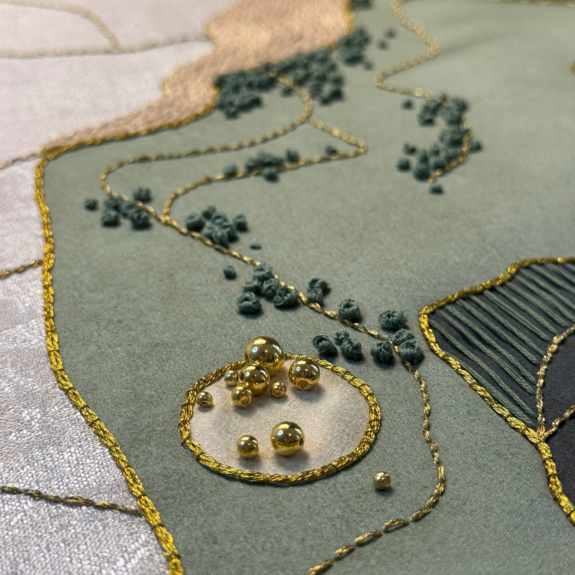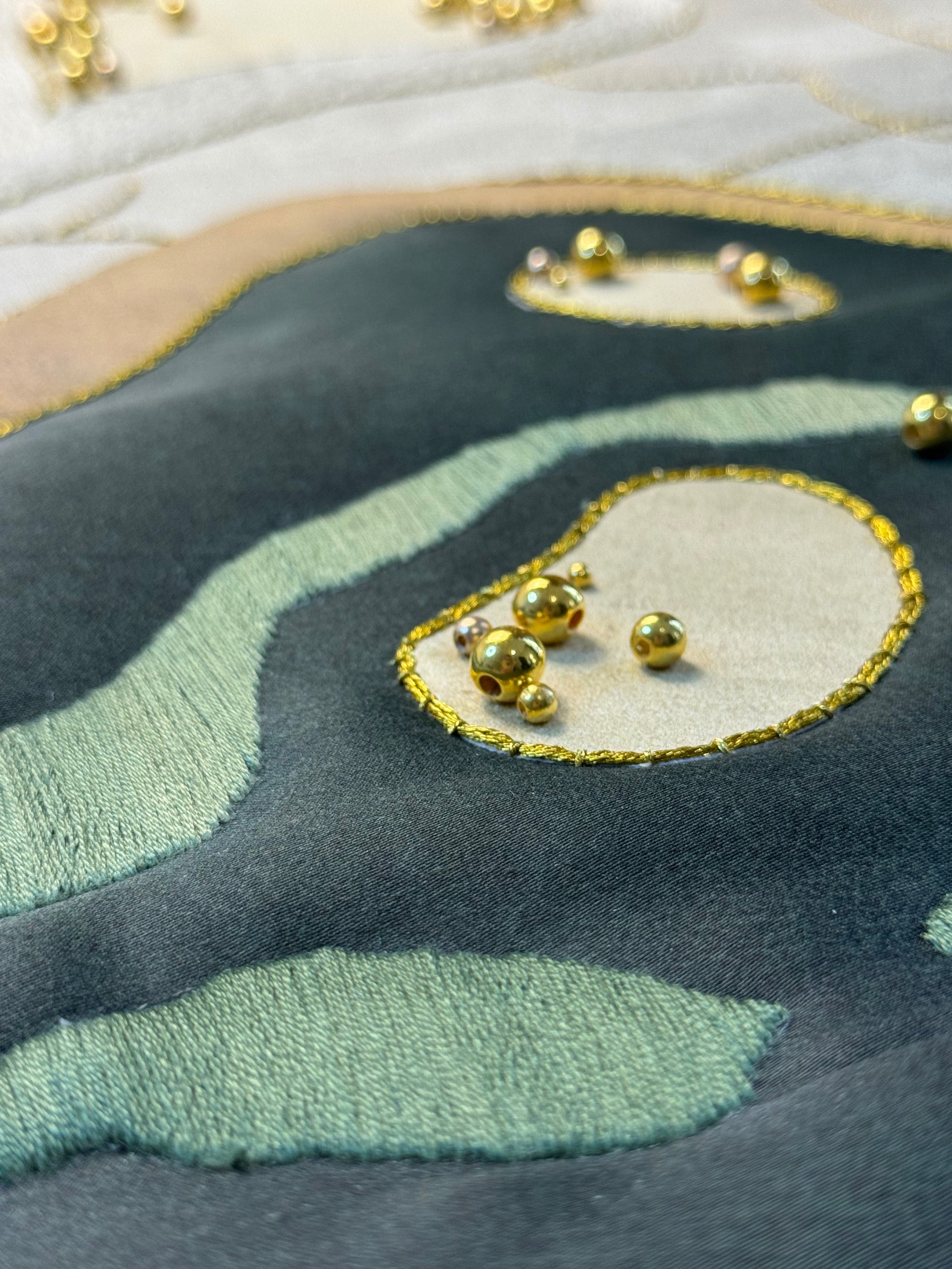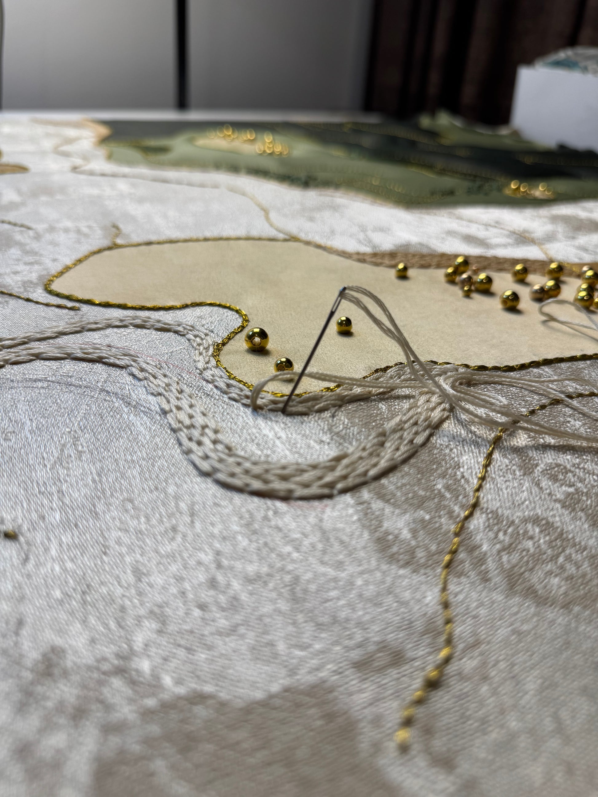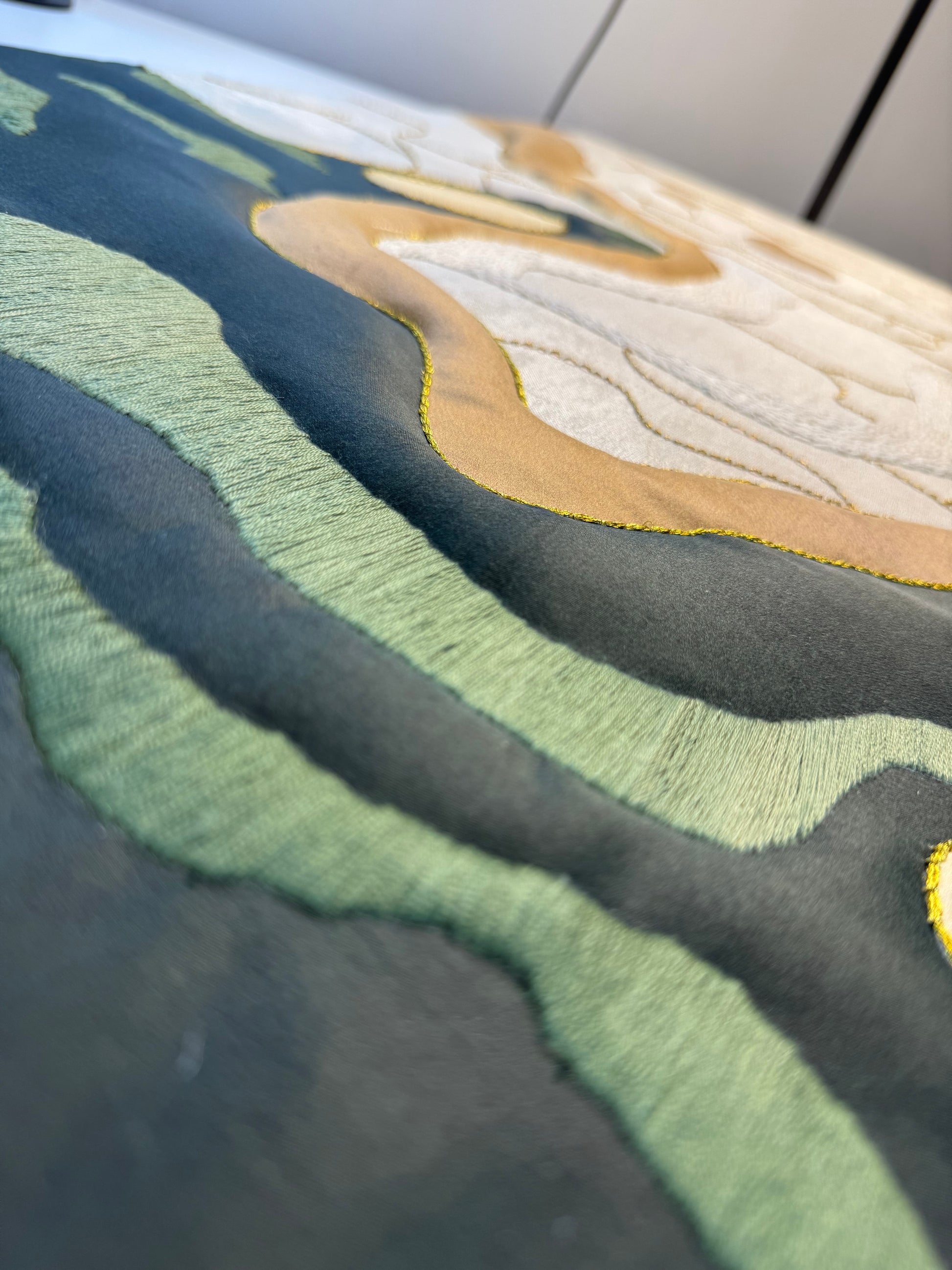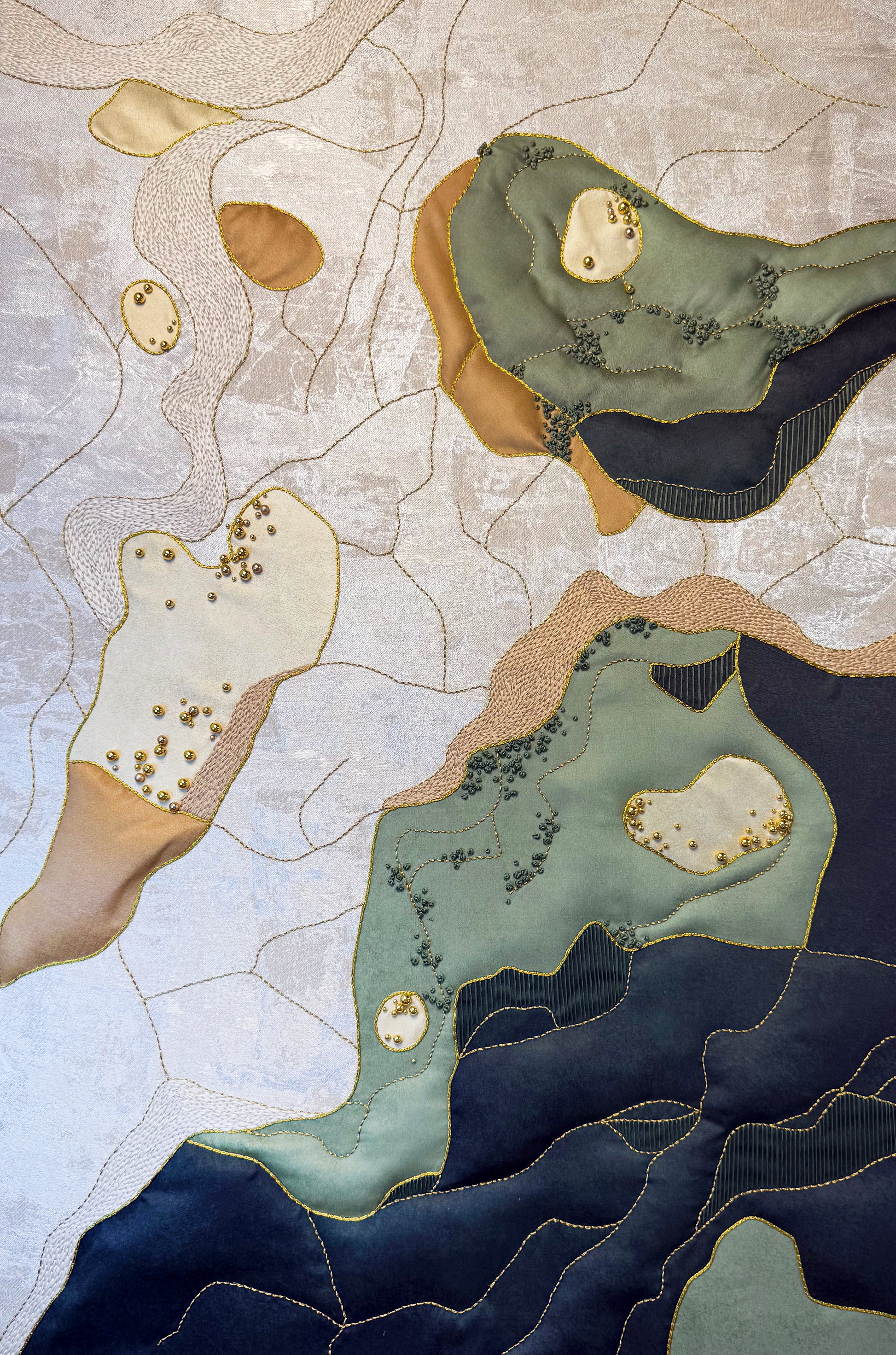 Textured mixed-media artwork featuring fabric collage, embroidery, and beadwork. As part of a two-piece set it shows an abstract aerial perspective.