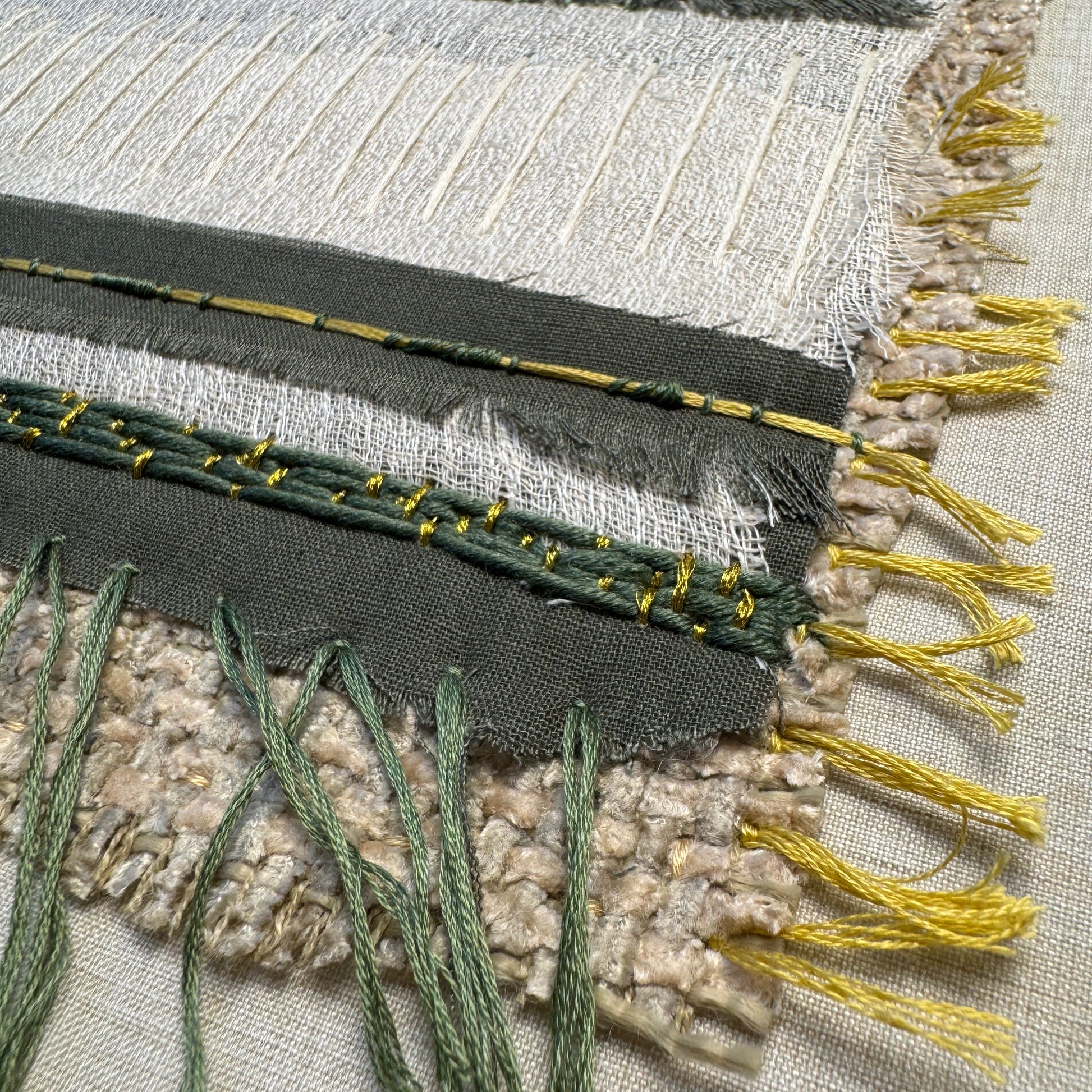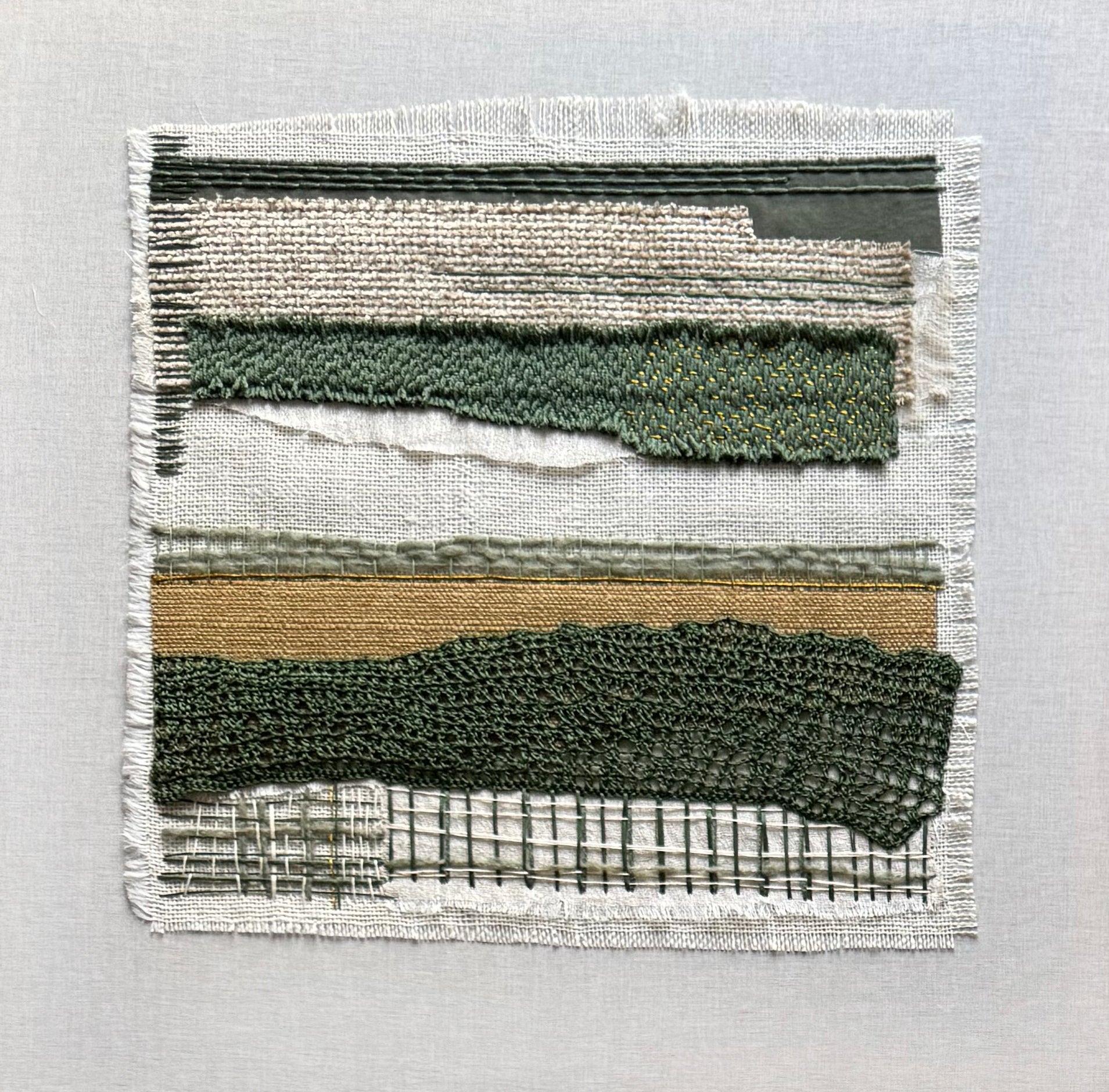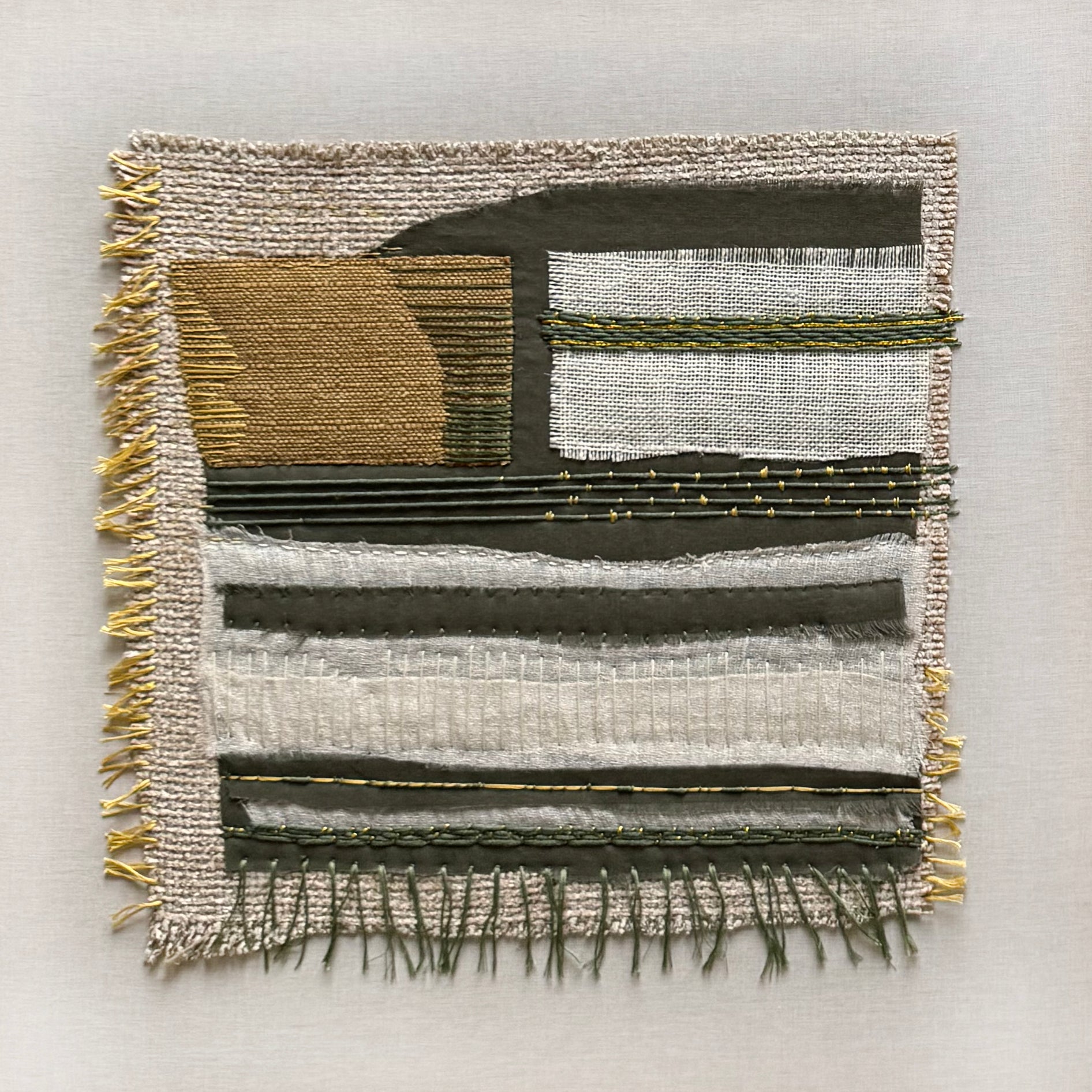 As part of a four-piece series this artwork explores the bold textures of fabric, embroidery, and weaving. Abstract compositions draw on the tonal richness and layered surfaces of nature.