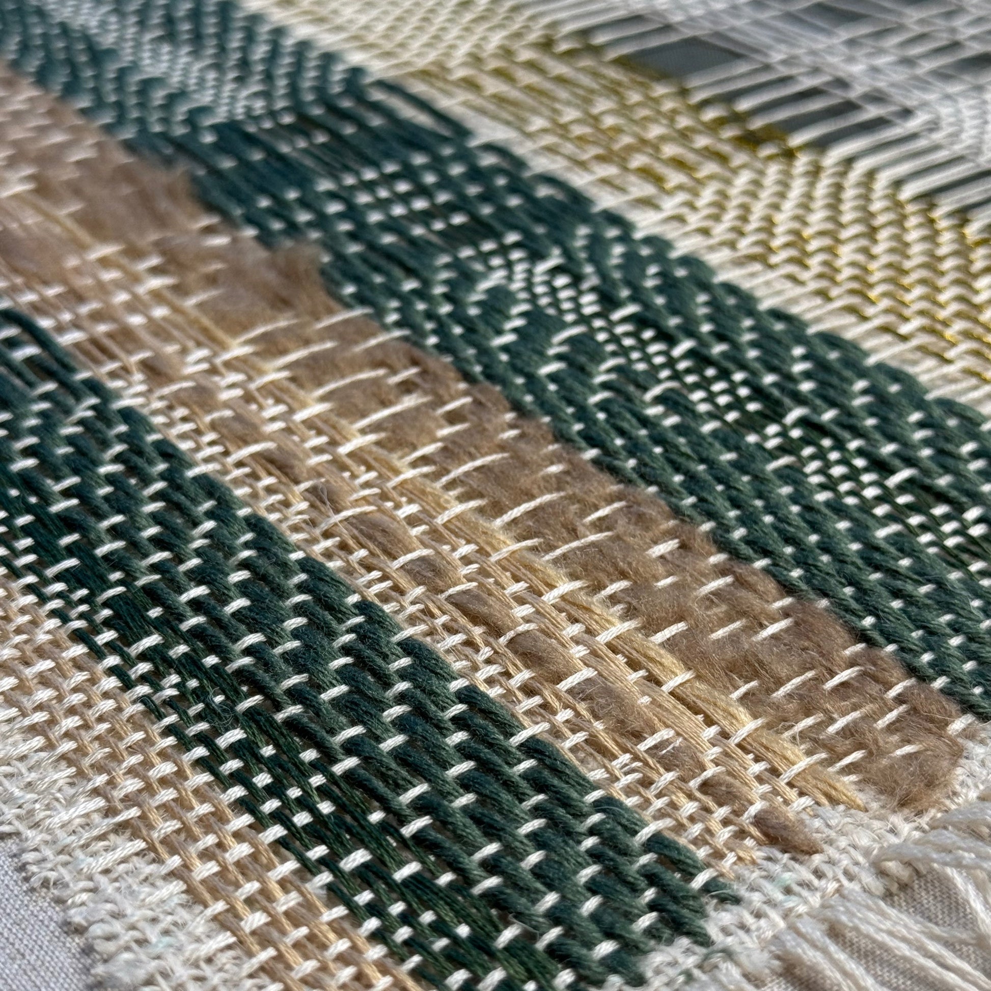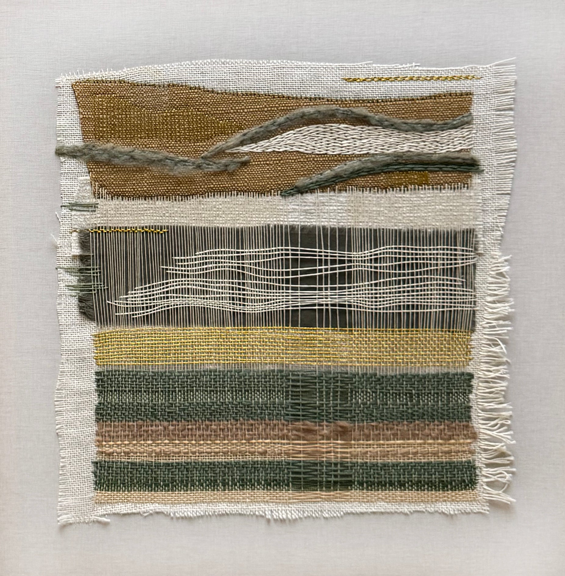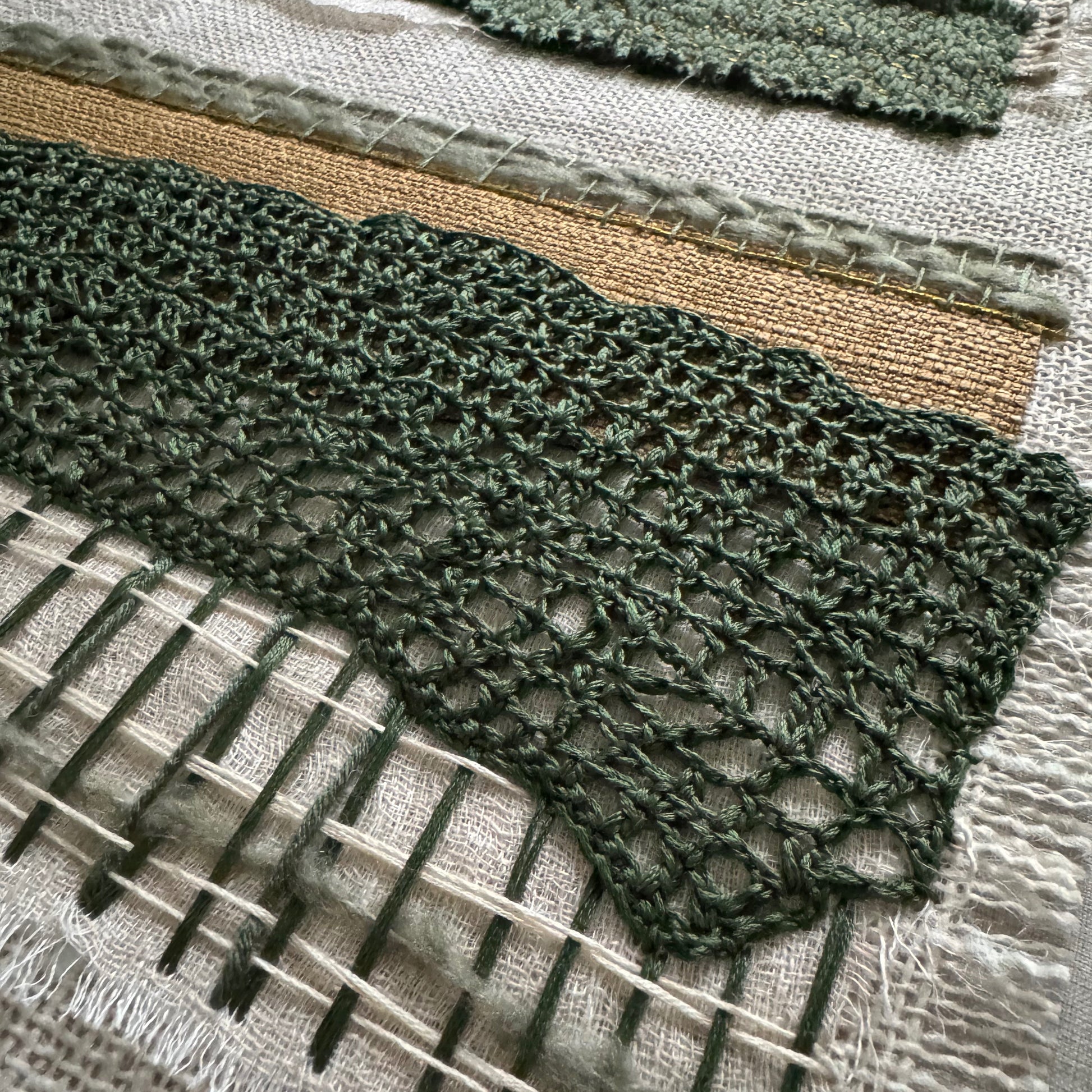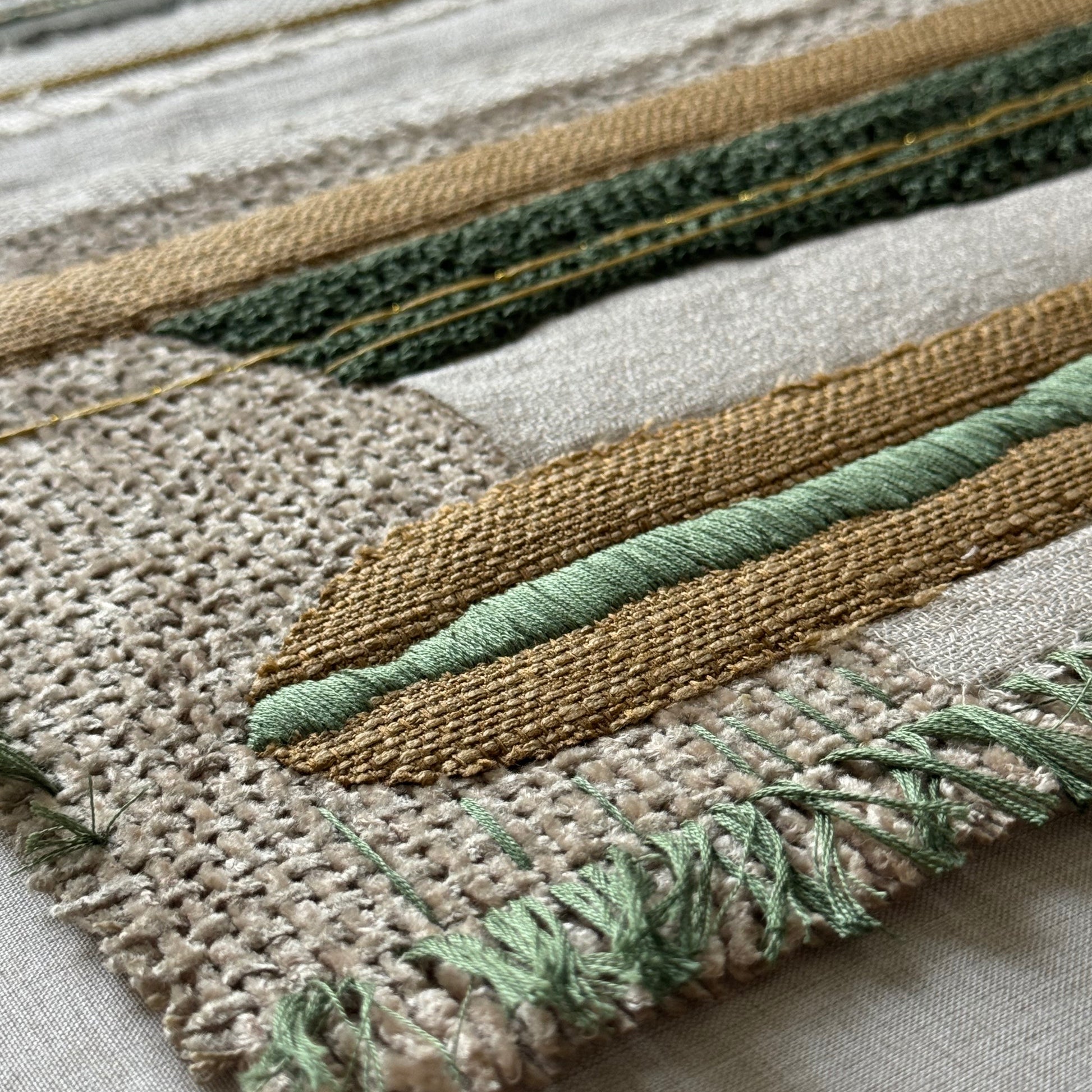 As part of a four-piece series this artwork explores the bold textures of fabric, embroidery, and weaving. Abstract compositions draw on the tonal richness and layered surfaces of nature.